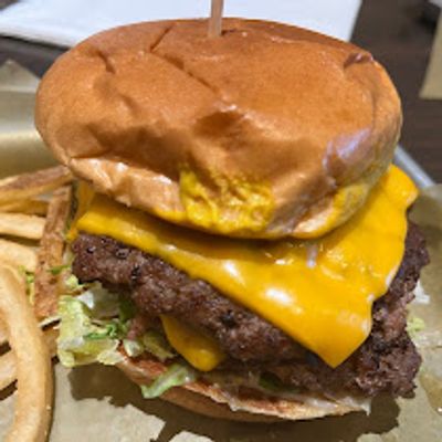 TWO HAND-SMASHED PATTIES, AMERICAN CHEESE, SHREDDED LETTUCE, TOMATO, PICKLES, MUSTARD, MAYO, CHALLAH BUN, NATURAL-CUT FRENCH FRIES